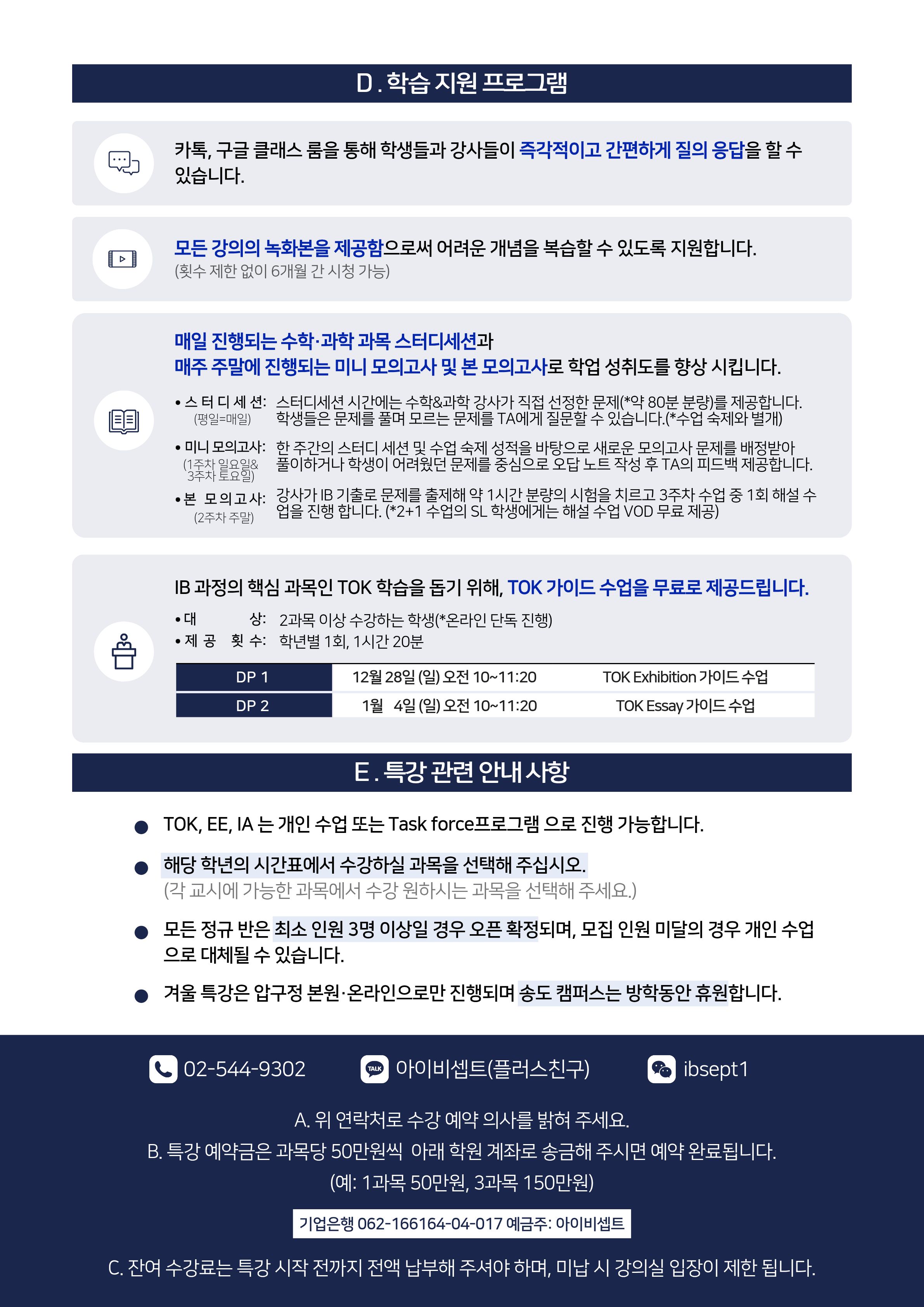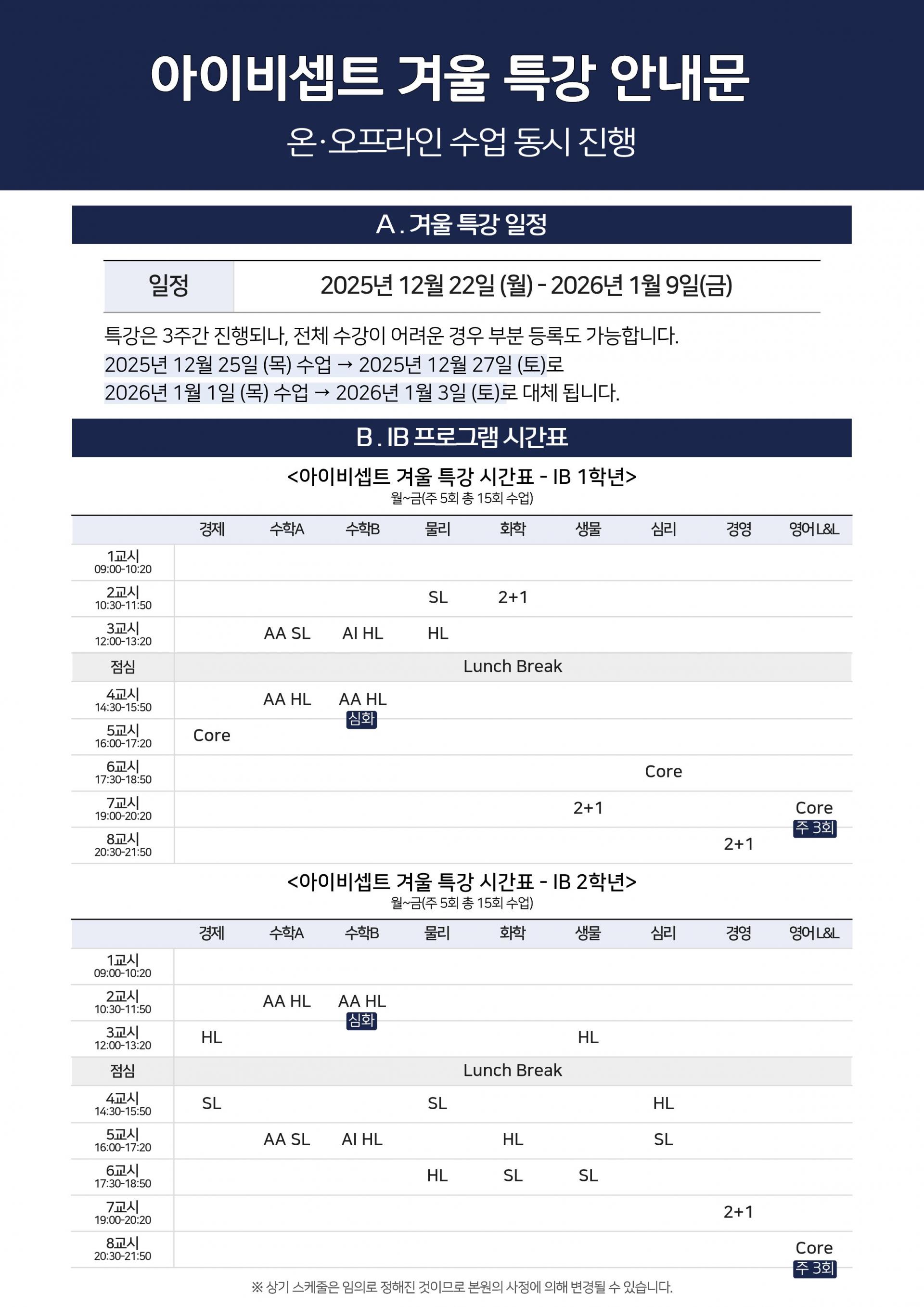 다가오는 겨울 방학, 아이비셉트 겨울 특강 일정을 안내드립니다.