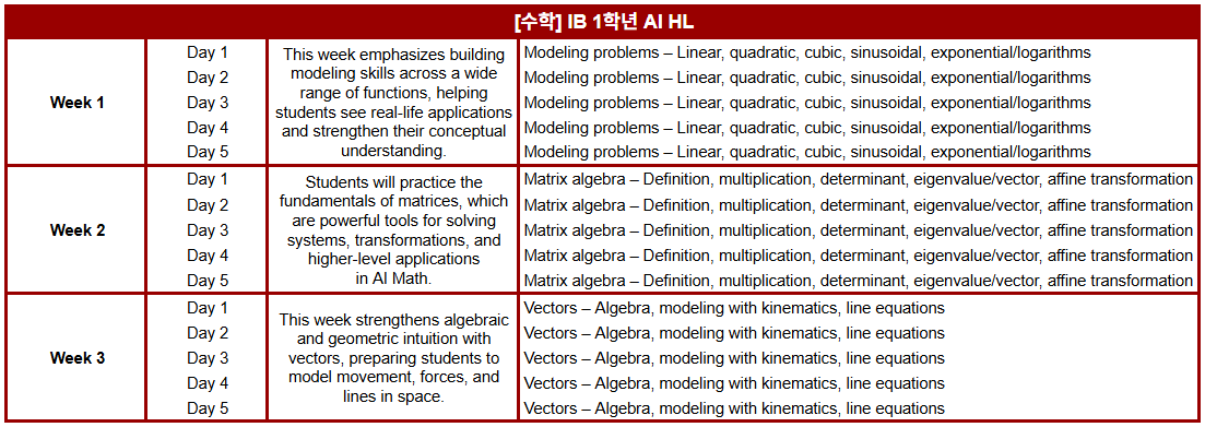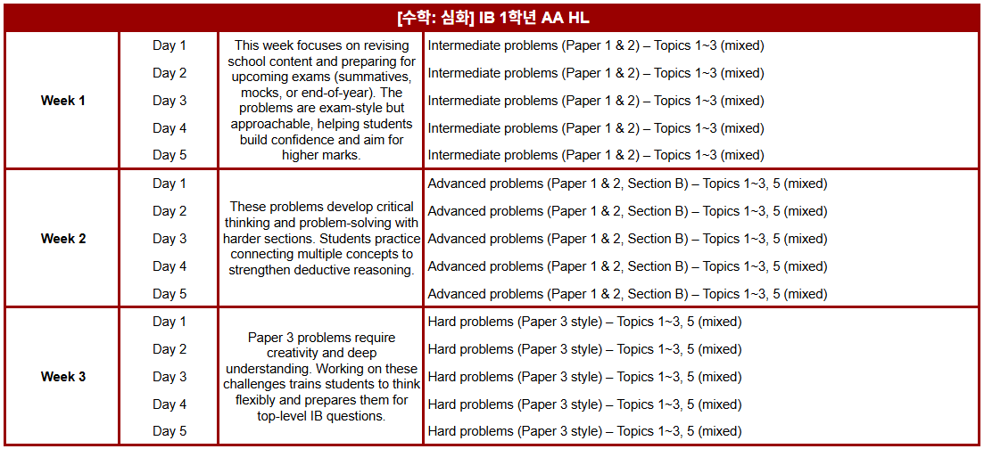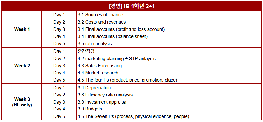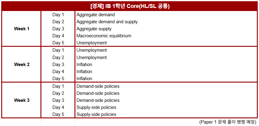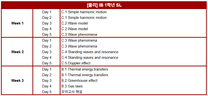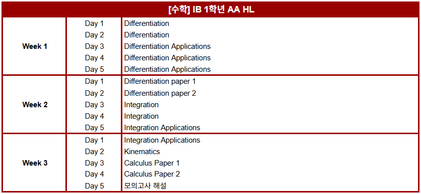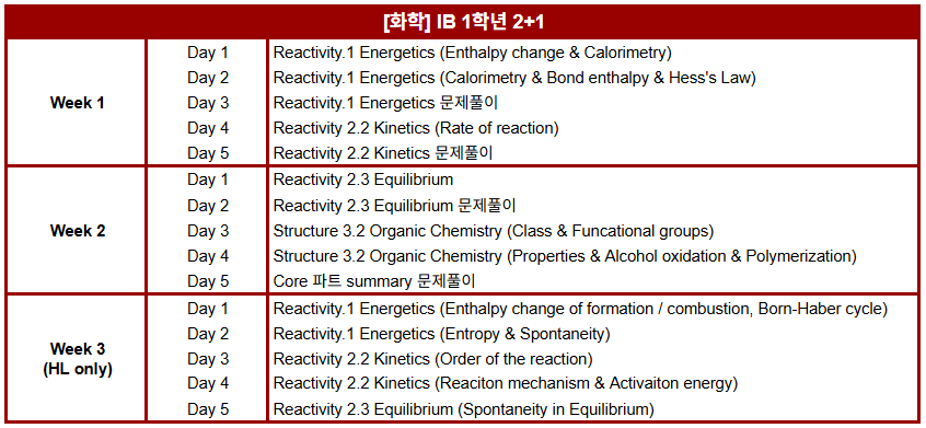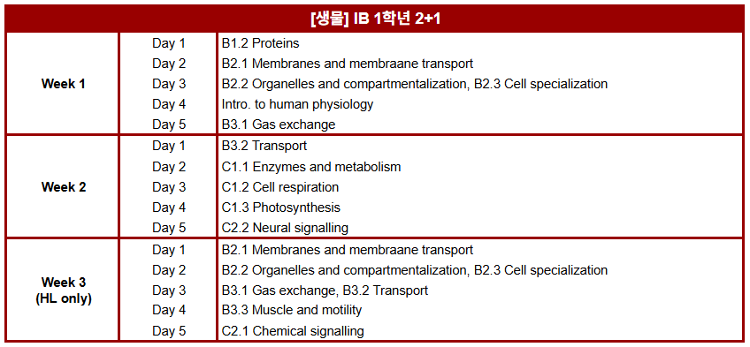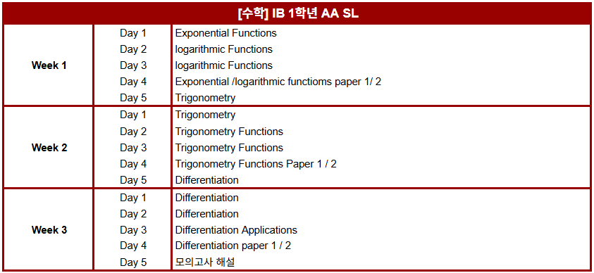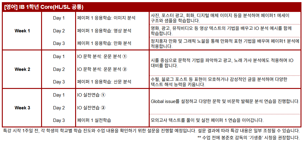 겨울 특강 IB 1학년 과목별 진도표 안내해 드립니다.