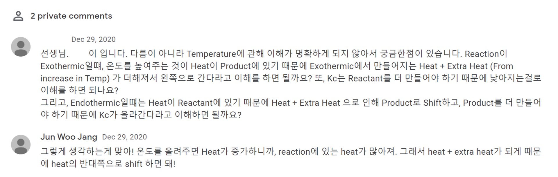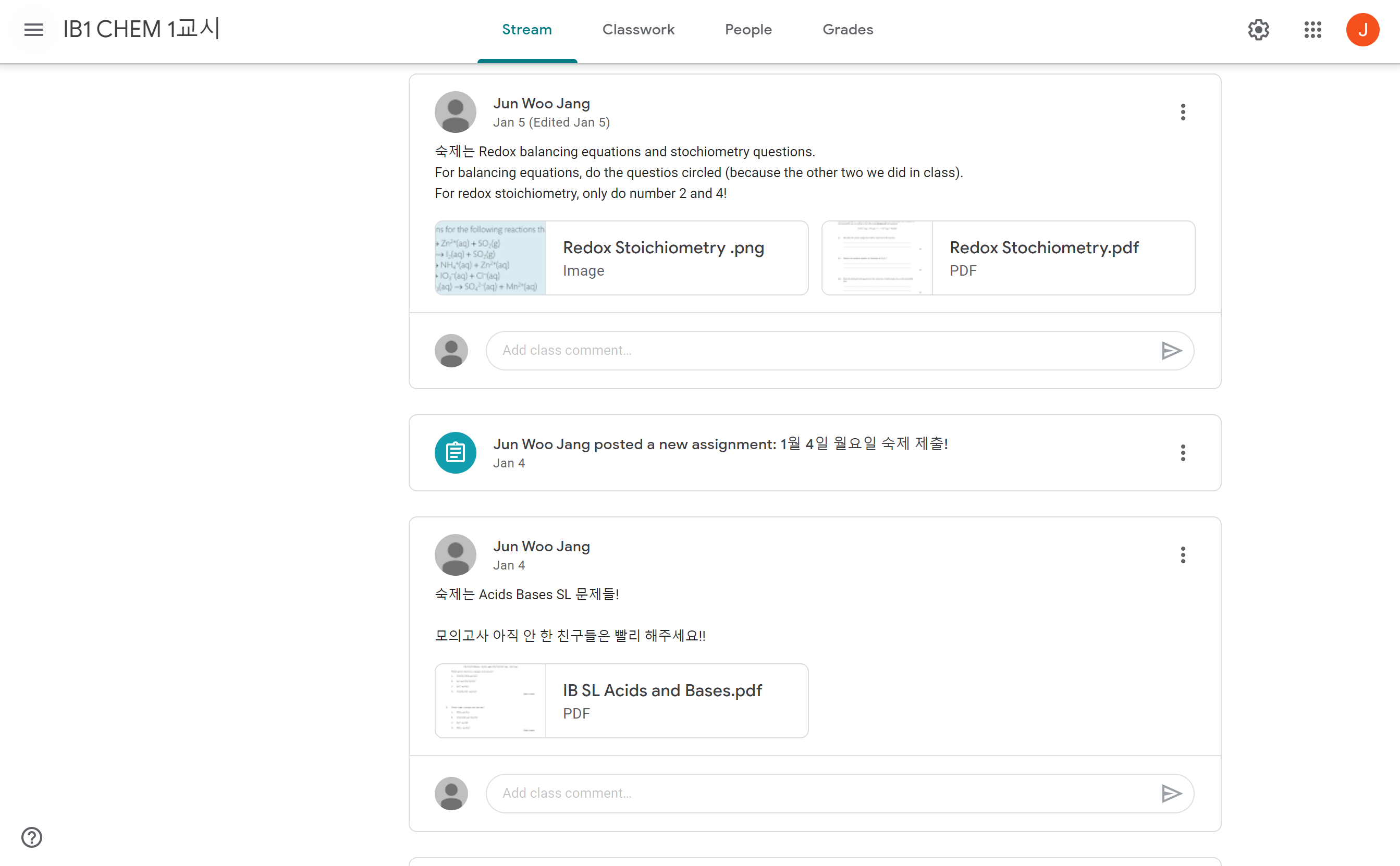 모든 학생은 각 과목에 해당하는 구글 클래스룸에 들어가서 수업 자료와 숙제를 다운 받을 수 있습니다. 학생이 질문이 있을 경우 (1) 구글 클래스룸에